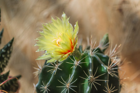 Cactus blooming in the botanical garden. Tropical nature background