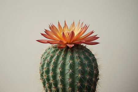 A blooming Mammillaria spinosissima cactus with spiny pincushion and bright flowers, clean backdrop with room for creative text