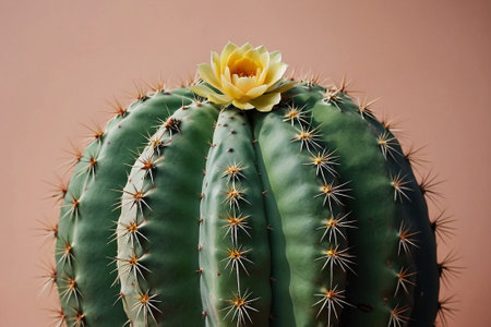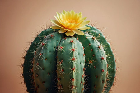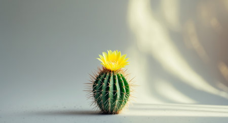 AI Generated. small cactus with bright green spines and yellow flower on top