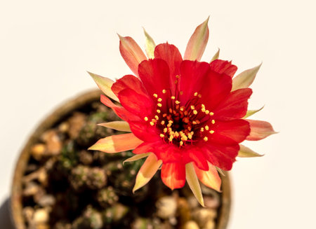 Red color delicate petal with fluffy hairy of Echinopsis Cactus flower on white background