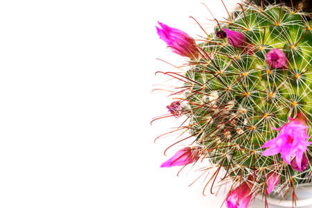 Mammillaria cactus flowers with pink blossom in a clay pot on white blurred background. Selective focus.