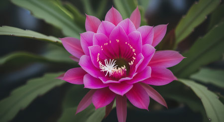 Vibrant pink cactus flower with layered petals and green leaves in bloom