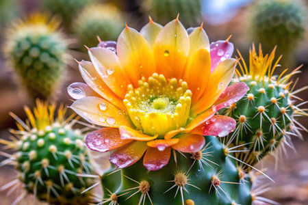 Close up of Mammillaria cactus flower with water drops.