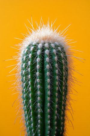 A tall green cactus stands prominently with vibrant yellow spines against a striking orange backdrop. This colorful contrast highlights the unique texture and features of the plant.