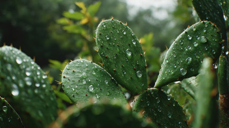 prickly pear in gentle light rain, soft raindrops visible on vivid green leaves, natural realistic style, bright fresh colors, balanced wide composition, cinematic framing, highly detailed, seamless for video continuation.