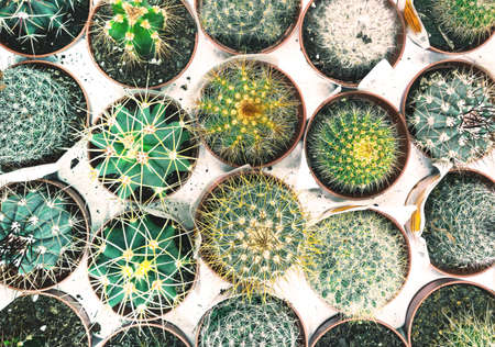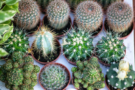 Collection of cactus plants in pots. Small ornamental plant. Selective focus, top-view shot. Cactus plant pattern. Natural background. Green texture background.