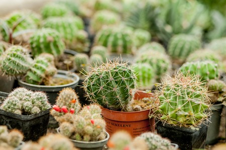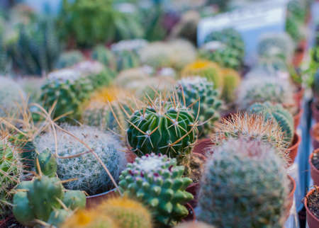 Gardening and growing concept. Cacti in pots growing in the greenhouse
