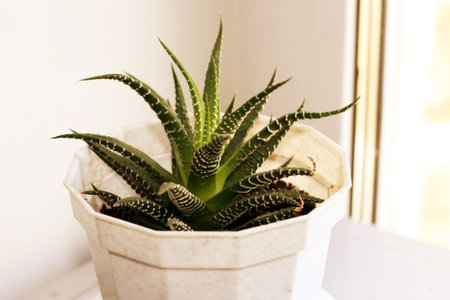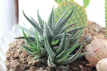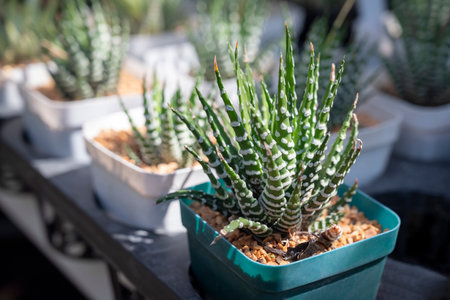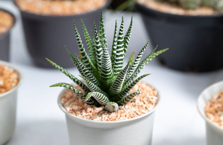 Close-up of a Haworthia zebra plant in a white potted. A small succulent plant with green leaves, slender, and white tubercles. The Ornamental plant for decorating in the garden or room decor.