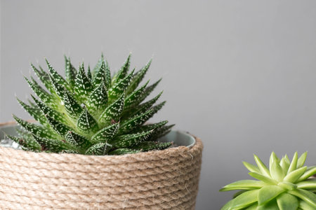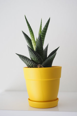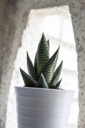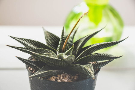 Succulent plant (Haworthia) with long stems and dark green leaves in a small flower pot for room decor