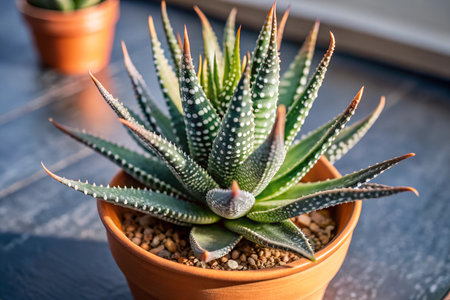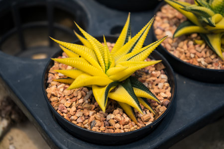 Close-up of Fairy washboard in a flowerpot. Beautiful small cactus for room decor. (Haworthia limifolia Marloth)