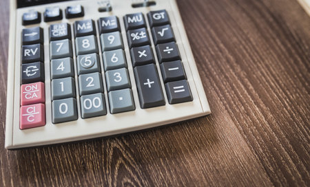 A calculator and a notebook on a wooden table with copy space. Selective focus.
