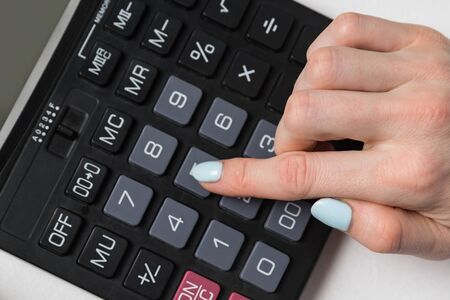 Male hand calculating taxes and budget or investing risks on white calculator over black background with copy space for text.