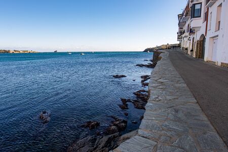 Facades of traditional white houses on the waterfront in Cadaques, Spain