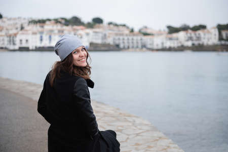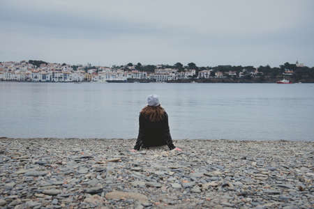 Rear view of a young woman sitting on the beach watching the shoreline from across the bay. Beautiful female wearing black coat an hat relaxing pensative on a cold spring day.