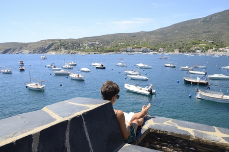 Woman reading a book with beatiful views to the Mediterranean sea in Cadaques, Girona, Catalonia, Spain.