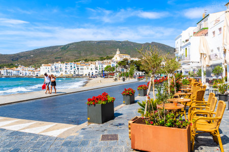 CADAQUES, SPAIN - OCTOBER 5, 2021: People visit picturesque fishing harbor of Cadaques in Catalonia region of Spain. The town is located in Alt Emporda county of Catalonia, Spain.