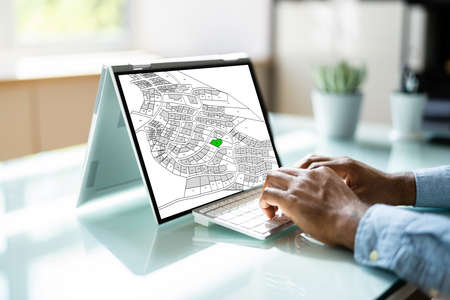 Cadastre Map And City Building Survey On Laptop