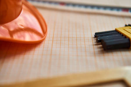 Helmet, desktop, drawings, rulers, construction, engineering.