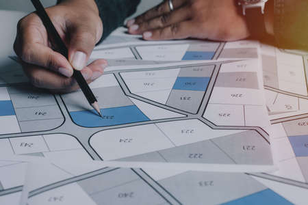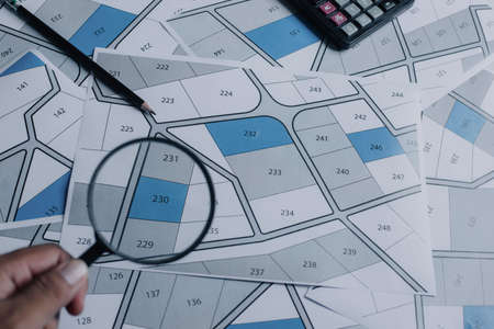 Sale of building plot of land for house construction. cadastral map on office background. house or residential i.e. construction, development, sale, buy.
