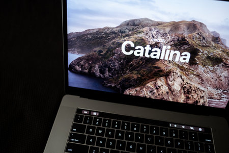 MacBook with Mac OS Catalina background logo on the screen, new operating system which will be released in the fall of 2019.