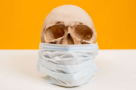 Skull of a man in a medical mask. The concept is the fitness of medical masks. Death from infectious disease. Concept - a person died from an epidemic. Bacteriological danger. viral disease
