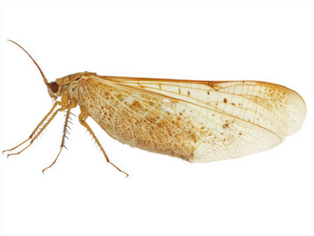 caddisfly rests on a branch, its slender wings folded and long antennae elegantly extended, highlighting the intricate beauty of this insect in a serene white background.