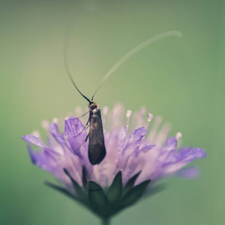 close-up of an insect with huge antenna on a purple wild flower in natural environment