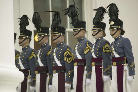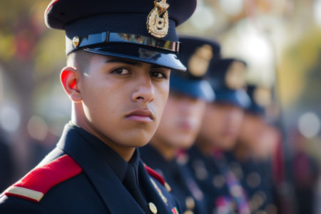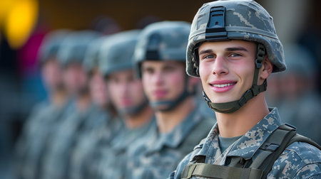 A group of military personnel in uniform stand in line, showing a serious and focused expression. They are likely participating in a parade or ceremony, representing their commitment to duty and service.