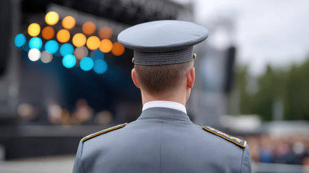 A solemn figure in a military uniform gazes towards an outdoor stage, where soft-focus lights illuminate a lively atmosphere, capturing a moment of reflection.