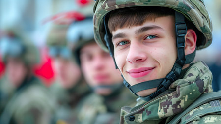 Young man in military uniform standing with a serious expression and commitment during a formal event, representing armed forces, public service, and patriotism