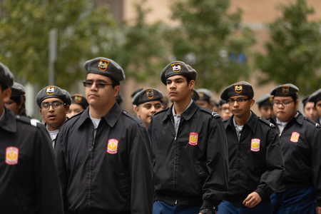 Houston, Texas, USA - November 11, 2018: The American Heroes Parade, Members of The Raul Yzaguirre T-stem Academy, Army JROTC Panther Battalion, marching down the road