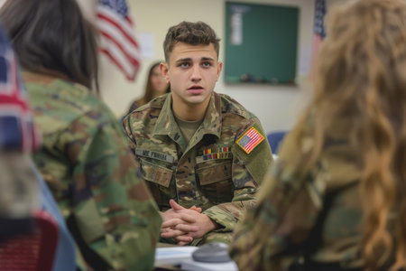 Uniformed recruiter speaking to young adults in a military office. Enlistment and career discussion concept. Design for poster, brochure.