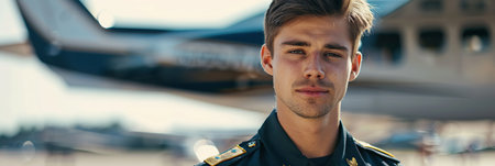Portrait of young Caucasian pilot standing in front of airplane at the airport