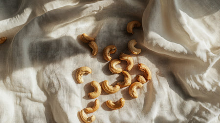 A beautiful arrangement of raw and roasted cashew nuts on soft fabric, showcasing their unique textures and colors. Ideal for health and food-related themes.