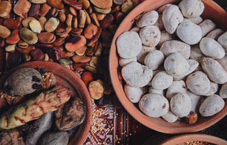 Potato, sweet potato and dried tubers with ancestral Andean techniques. Close up, Grains such as beans.