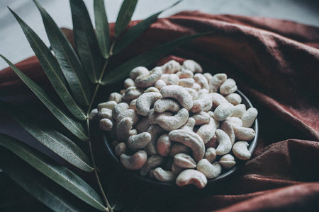 Roasted cashew nuts in a bowl with green leaves on the background.