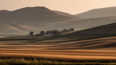 Serene landscape featuring rolling hills and fields bathed in warm sunlight, with distant farmhouse nestled among hills. scene evokes sense of tranquility and natural beauty