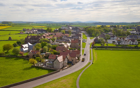 View from Bamburgh Castle-Northumberland: A charming village set in a lush green countryside with a winding road and scattered houses under a cloudy sky.