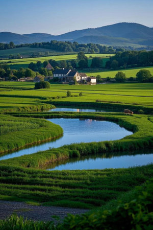 beautiful landscape of fields, river and sky