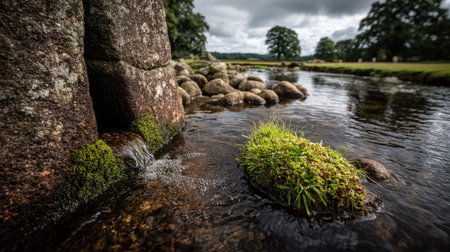 Beautiful green moss growing between rocks in a lake with a stormy sky