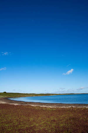 A tranquil coastal landscape features still water mirroring the expansive blue sky. Soft sand dunes frame the scene creating a peaceful atmosphere during daylight hours.