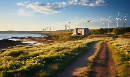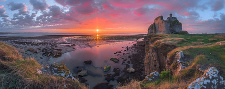 Capture the mesmerizing beauty of a radiant sunset, casting an ethereal glow upon ancient coastal ruins Serene turquoise waters reflect the hues of the sky, while dramatic clouds paint an ever-changing canvas overhead This captivating scene invites tranquility and inspires awe in the face of nature's grandeur AI Generative