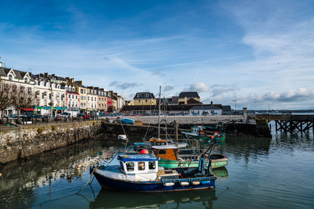 Panoramic cityscape, a view from the coast of bay of Douarnenez. Blue sky with colorful evening clouds. Reflections on the water. Brittany, France