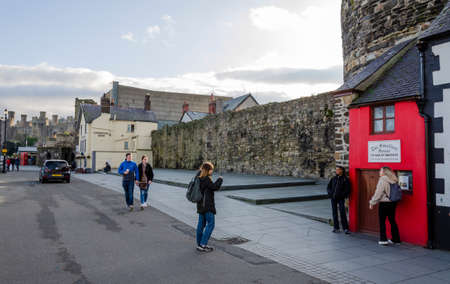 Conwy, Wales, UK : Jan 25, 2020: Tourists enjoy spending time taking photographs at the Smallest House in Great Britain.