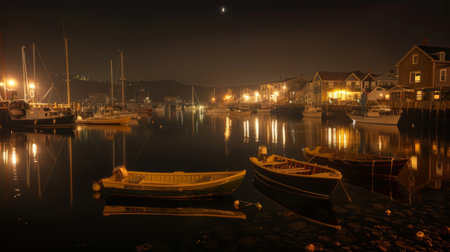 A row of boats bob gently in the harbor illuminated by the soft glow of the moons reflections
