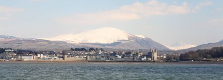 Medievil Caernarfon castle and town with Snowdonia as a back drop in north Wales