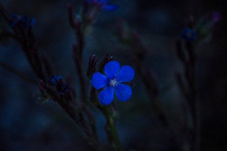 Beautiful blue flowers on a dark background. Floral background.