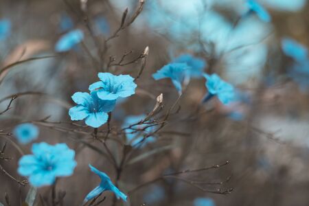 Close up macro scene of beautiful small blue flowers in the field