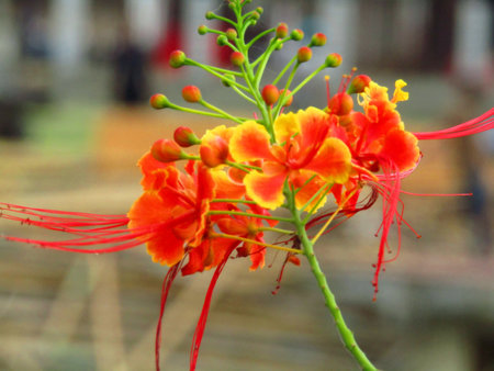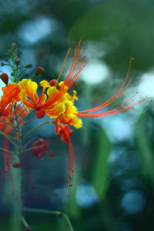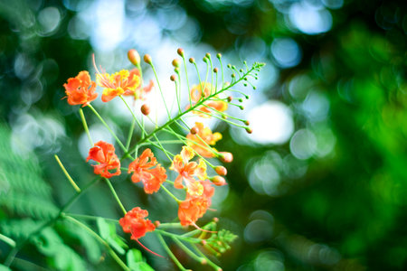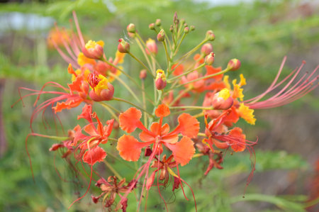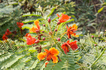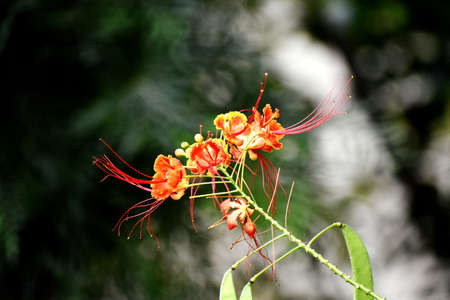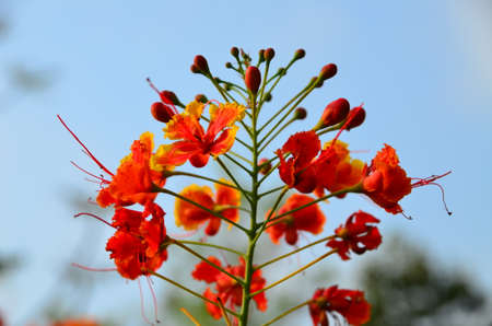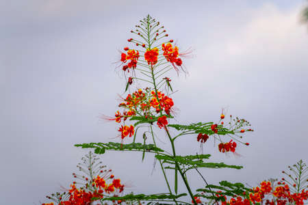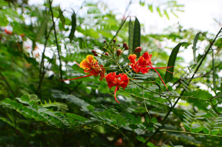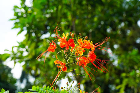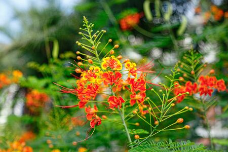 Peacock Flower,Caesalpinia pulcherrima Sw,Tropical plant tree with colorful flowers in red, orange and yellow under natural sunlight outdoor