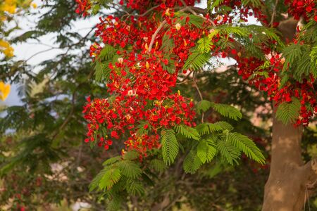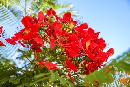 Delonix regia tree crown on bright summer day with clear blue sky on background and copy space. Summer background with blooming tree. Plant species name - Delonix regia (Hook.) Raf. Stock photo.